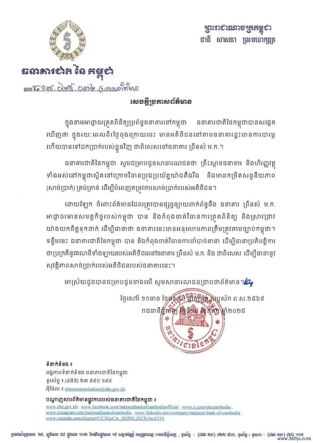 ◎ 柬国行发布公告恢复挤兑潮,默示银行现款储备充足